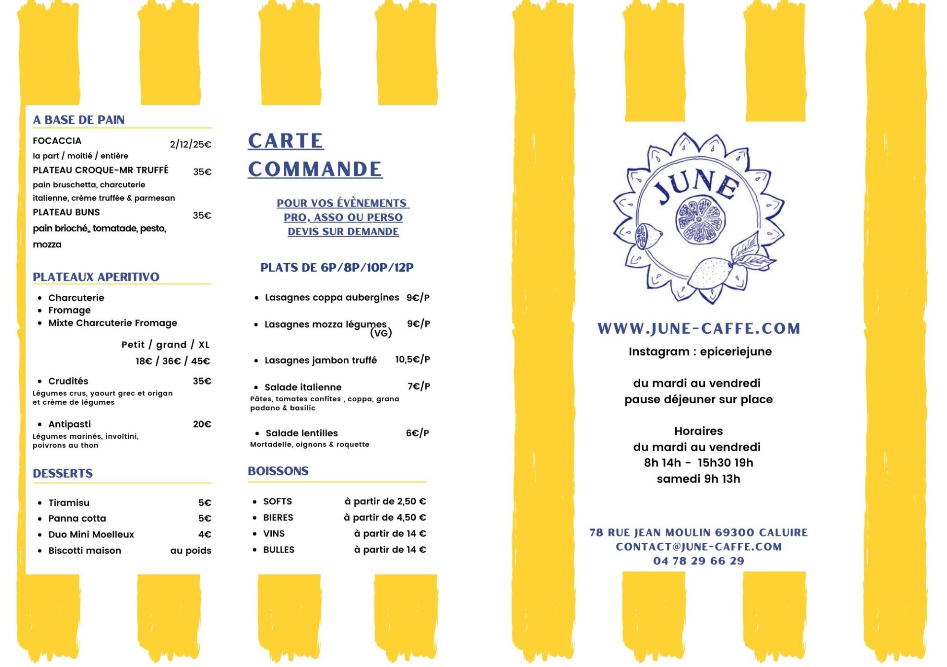 June, c'est une épicerie méditerranéenne de proximité, fondée avec l'envie de proposer plus qu'un simple commerce : un lieu de vie, d'échanges et de saveurs. Située à Caluire, près de Lyon, June met à l'honneur les produits emblématiques du bassin méditerranéen – huiles d'olive, antipasti, sauces, pâtes fraîches, vins, fromages et charcuteries – en privilégiant des producteurs engagés, des circuits courts et une sélection artisanale. June, c'est aussi un lieu vivant, qui évolue au fil des saisons et des rencontres : Un comptoir café ouvert le matin, une terrasse conviviale pour profiter du soleil, une offre de restauration simple et maison à emporter ou sur place, des privatisations, un service traiteur sur-mesure pour les entreprises et les particuliers, une communication chaleureuse et spontanée sur les réseaux et par newsletter